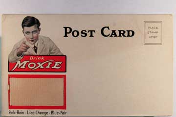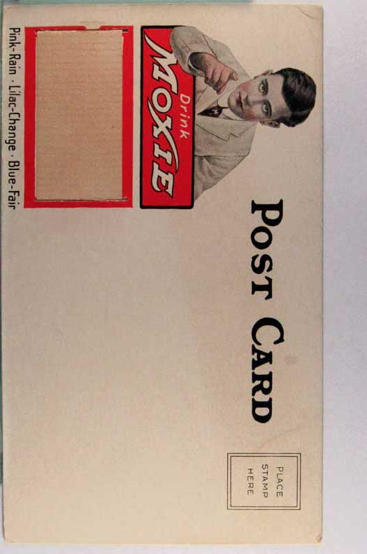 Lot #26. View Larger | Rotate Adv. Moxie Soda, Unusual w/ Die-Cut Label Attachment, “Pink Rain” UB m cor cr F-VF