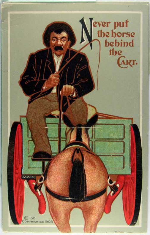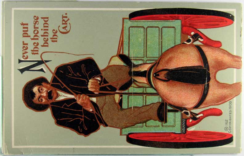 Lot #6. View Larger | Rotate Early Livermore & Knight, “Never Put the Horse Behind The Cart”, Die-Cut Adv. Horse Carts, UB m cor crs & hinge wear F-VF