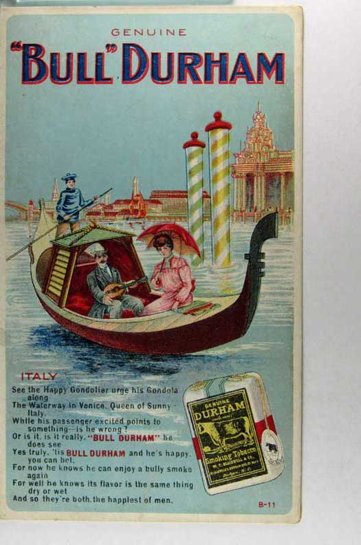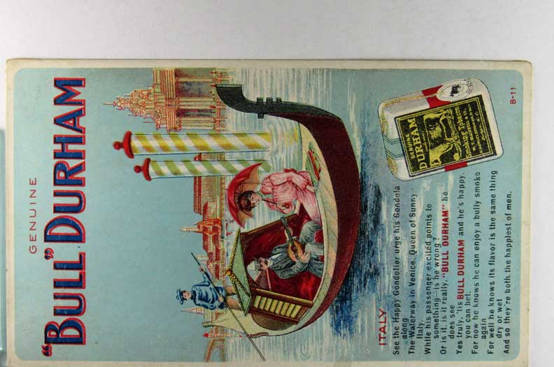 Lot #20. View Larger | Rotate Poster Card Adv. Bull Durham Smoking Tobacco, #B-11, “Italy” DB m wear Near VF