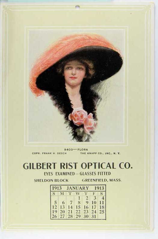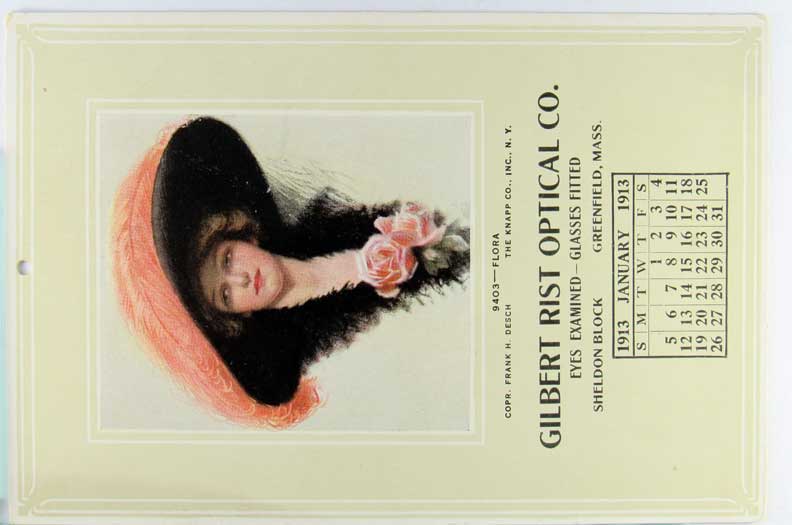 Lot #13. View Larger | Rotate Adv. Gilbert Rist Optical Co., Greenfield, Massachusetts, w/ 1913 Calendar DB cor cr Near VF