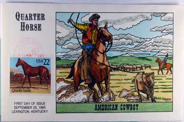 Lot #104. View Larger | Rotate Hand-Painted First Day Cover by Collins, Quarter Horse, “American Cowboy”, 1985 VF
