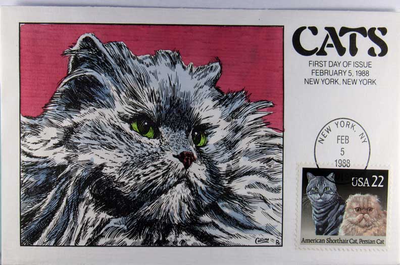Lot #103. View Larger | Rotate Hand-Painted First Day Cover by Collins, Cats, 1988 VF
