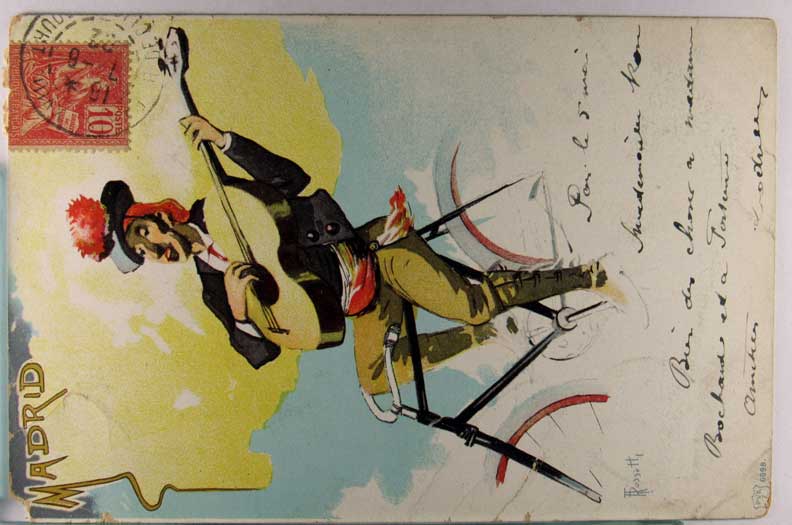 Lot #137. View Larger | Rotate French Pub. Art Card, Bicycles and Riders of Different Lands Ser., #6096, “Madrid”, Art. Sig. UB m flts Near F-VF