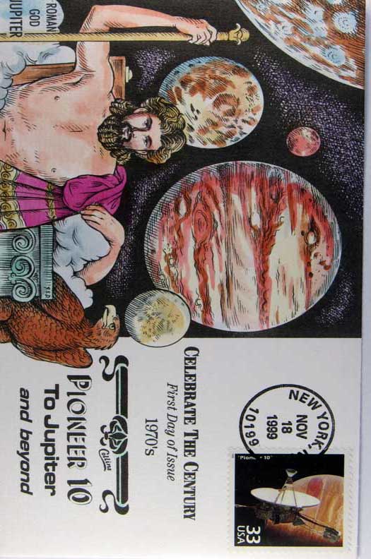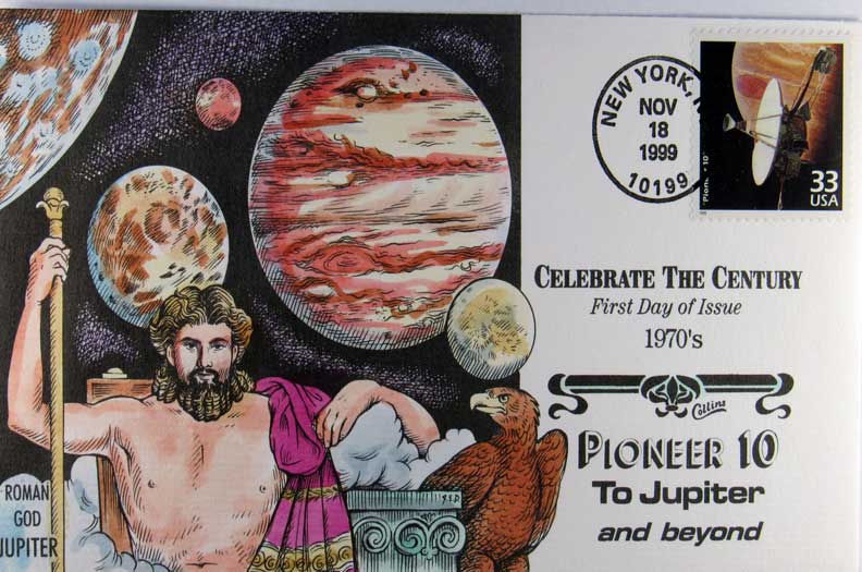 Lot #1381. View Larger | Rotate Hand-Painted First Day Cover by Collins, Space Exploration, “Pioneer 10 to Jupiter and Beyond”, 1999 VF
