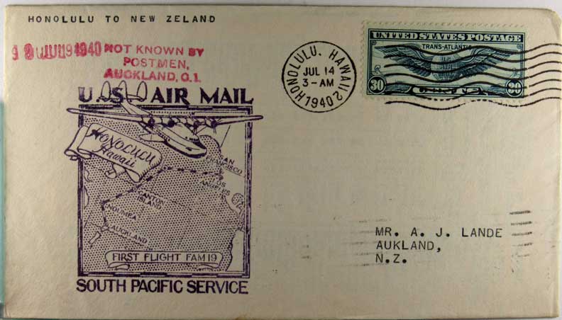 Lot #1344. View Larger | Rotate Cover, Pacific Clipper First Flight Cover, July 14, 1940, Honolulu to New Zealand VF