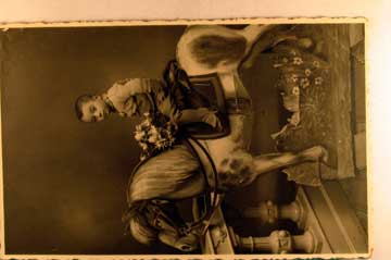 Lot #372. View Larger | Rotate B&W photo, Young Boy on Studio Prop Pony DB cor cr near VF