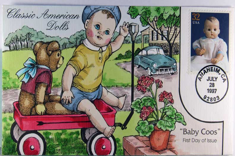 Lot #413. View Larger | Rotate Hand-Painted First Day Cover by Collins, Classic American Dolls, “Baby Coos”, 1997 VF