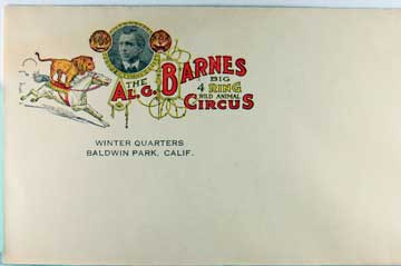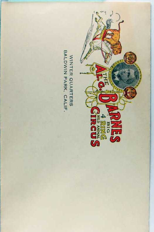 Lot #400. View Larger | Rotate Envelope Adv. A.L.G. Barnes Circus, Baldwin Park, California VF