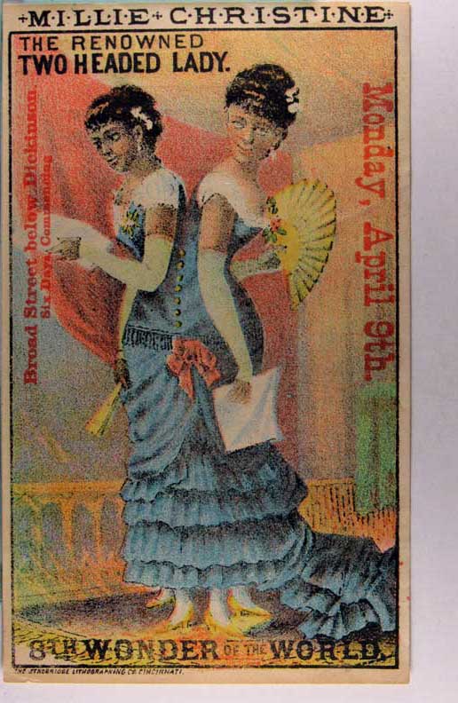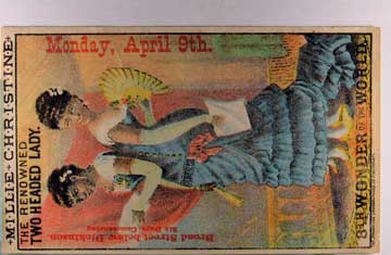 Lot #378. View Larger | Rotate Trade Card Adv. Millie Christine - Black Two-Headed Lady VF