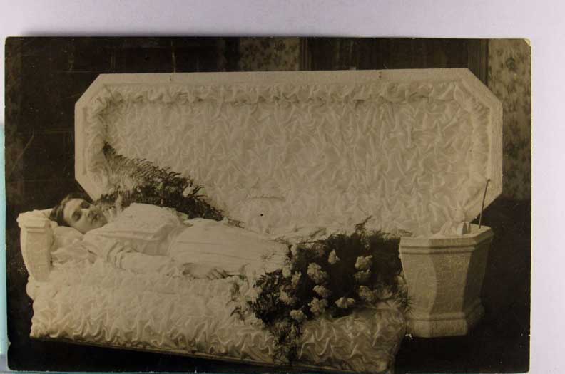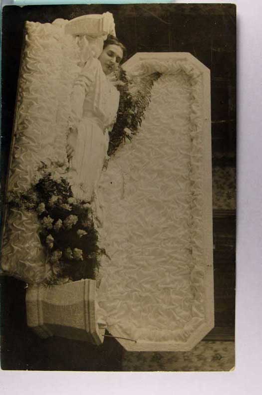Lot #430. View Larger | Rotate Macabre Woman in Coffin, Real Photo w/ AZO P.C. back m cor cr F-VF