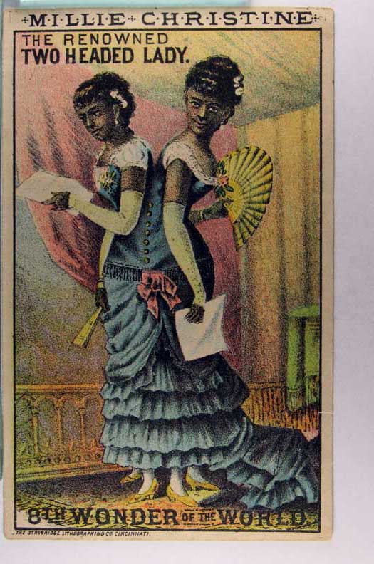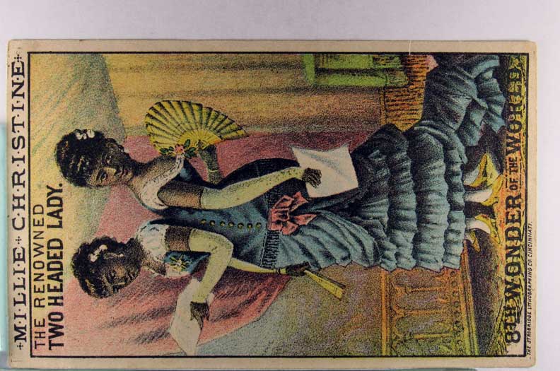 Lot #396. View Larger | Rotate Trade Card Adv. Millie Christine - Black Two-Headed Lady VF
