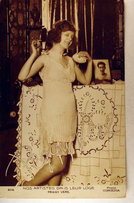 Lot #446. View Larger | Rotate French B&W photo, Nos Artistes Dans Leur Loge ser., # 206, “Peggy Vere” m cor wear F
