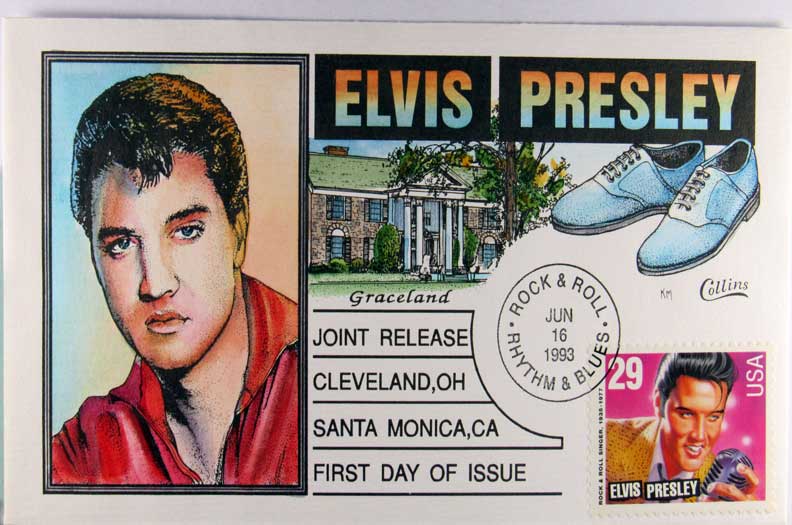 Lot #516. View Larger | Rotate Hand-Painted First Day Cover by Collins, Elvis Presley, 1993 VF