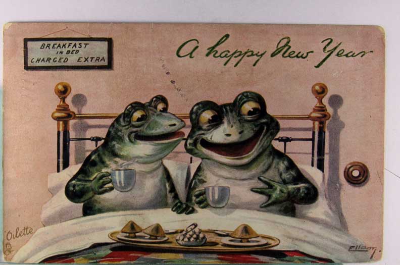 Lot #444. View Larger | Rotate Fantasy Frogs, R. Tuck pub. Breakfast In Bed Ser. 9321, Art. Sig. Ellam DB cor wear & m cof Near F-VF