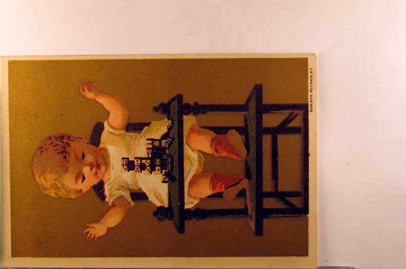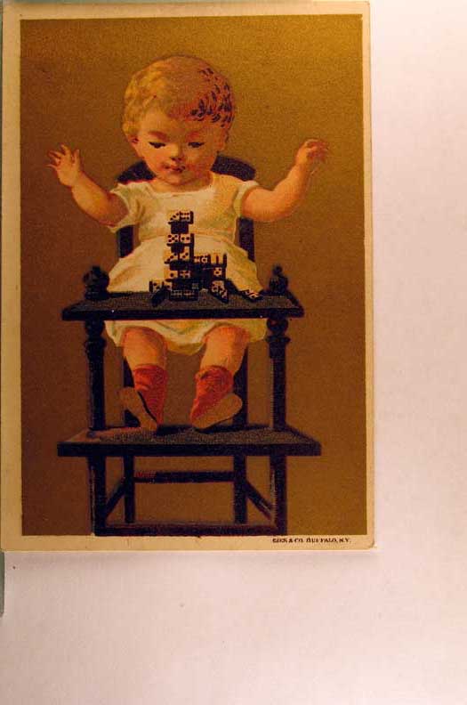 Lot #1628. View Larger | Rotate Trade Card Adv. New Buckeye Table Rake, Akron, Ohio w/ Illust. On Back, Baby Playing w/ Dominoes VF