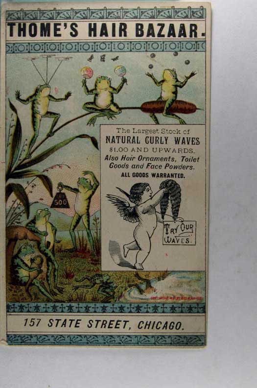 Lot #1608. View Larger | Rotate Trade Card Adv. Thome’s Hair Bazaar, w/ Fantasy Frogs Near VF