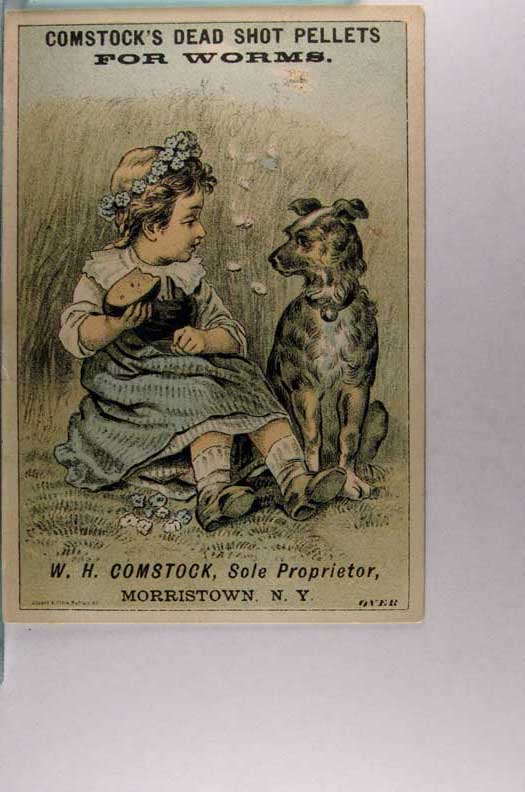 Lot #1628. View Larger | Rotate Trade Card Adv. Comstock Dead Shot Pellets Children’s Dewormer Medicine VF