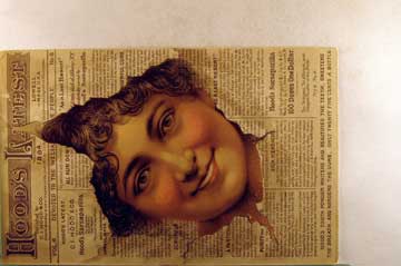 Lot #1616. View Larger | Rotate Trade Card Adv. Hood’s Sarsaparilla, Newspaper Like w/ Woman’s Face, cpr. 1884 back flts