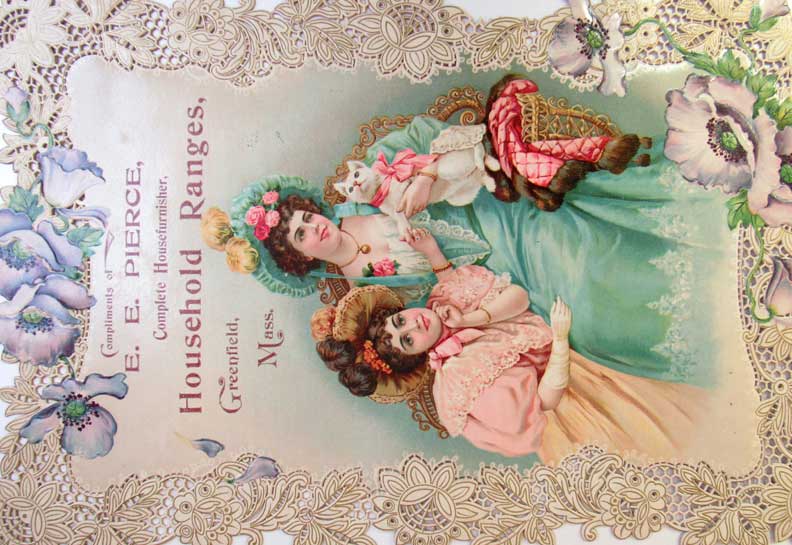Lot #1651. View Larger | Rotate Very Large Ornate Die-Cut w/ Househol Ranges Adv., Greenfield, Massachusetts, 9 1/2” x 14”, Very Nice VF