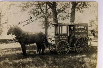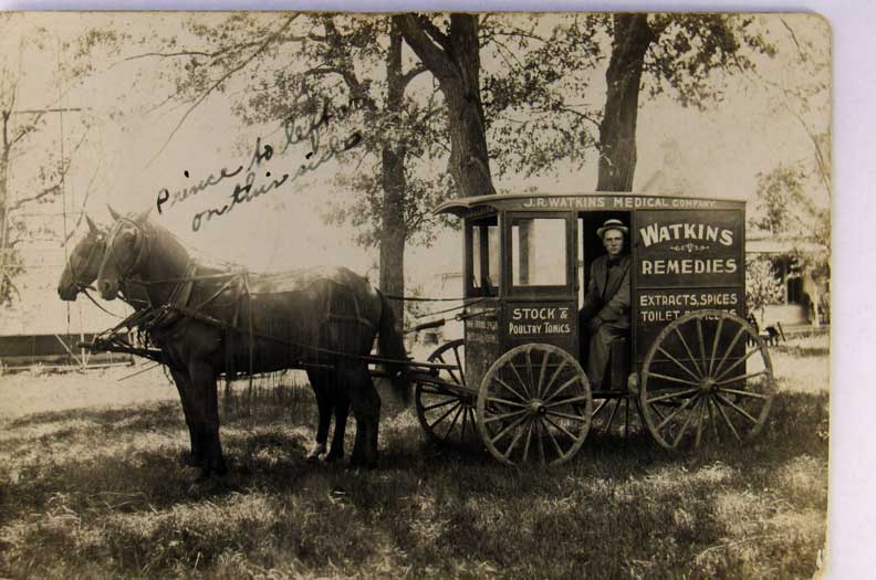 Lot #1458. View Larger | Rotate Horse-Drawn Wagon Adv. Watkins Remedies, Real Photo, Used Minnesota 1911 cor wear & m wof Near F-VF