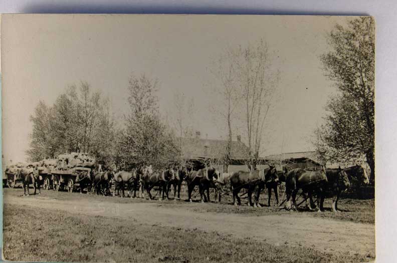 Lot #1467. View Larger | Rotate Horse-Drawn Wagon, Real Photo w/ Velox P.C. back, 15 Horse Team Pulling Three Wagons m cor wear F-VF