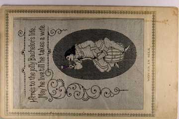 Lot #860. View Larger | Rotate Novelty Woven Silk, “Here’s to the Jolly Bachelor’s Life” UB cor wear & sts F-VF