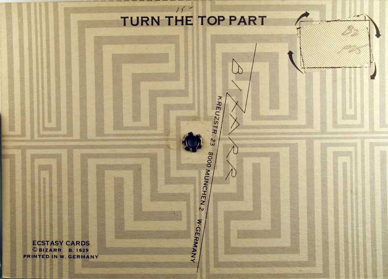 Lot #895. View Larger | Rotate Novelty Two Layer Postcard w/ Plastic Layer, Turn and Creates Psychedelic Effect, Great German pub., Showing Back of Card 1970’s VF