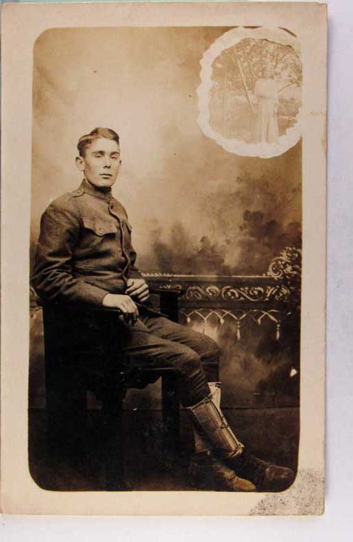 Lot #321. View Larger | Rotate Arcade Style Real Photo w/ AZO P.C. back, Incl. U.S. Soldier & Photo Manipulated Girl Back Home, Dated 1918 m cor soil Near VF