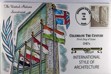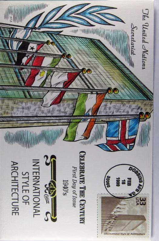 Lot #1104. View Larger | Rotate Hand-Painted First Day Cover by Collins, “The United Nations Secretariat”, 1999 VF