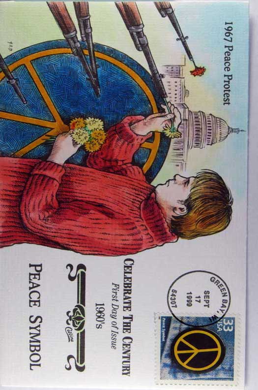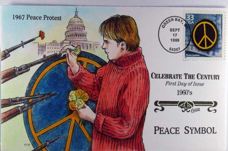 Lot #1103. View Larger | Rotate Hand-Painted First Day Cover by Collins, Hippy Related, “1967 Peace Protest”, 1999 VF