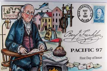 Lot #1102. View Larger | Rotate Hand-Painted First Day Cover by Collins, U.S. Patriotic, “Pacific 97” w/ Benjamin Franklin, 1997 VF