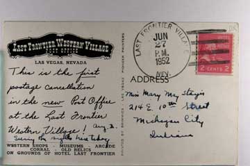 Lot #1246. View Larger | Rotate Last Frontier Village “First Postage Cancellation”, Used June 27, 1952 VF