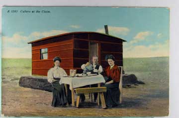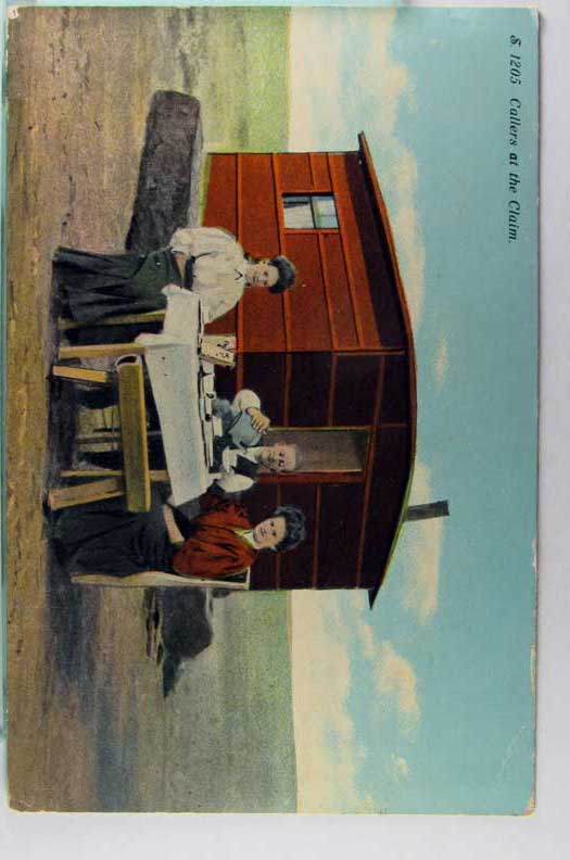 Lot #1600. View Larger | Rotate Western Theme, “Callers at the Claim”, Tinted Printed Photo, Used Forest Grove, Montana 1911 DB crs & wear F