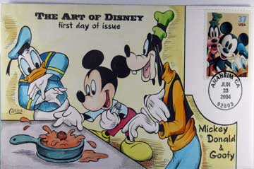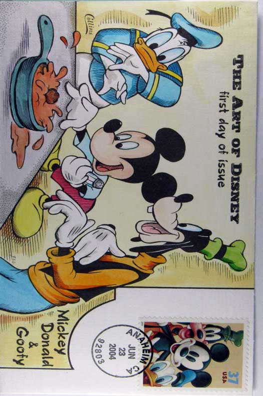 Lot #1576. View Larger | Rotate Hand-Painted First Day Cover by Collins, Disney, “Mickey, Donald & Goofy”, 2004 VF