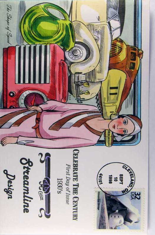 Lot #1600. View Larger | Rotate Hand-Painted First Day Cover by Collins, Celebrate the Century, “Streamline Design”, w/ Radio, Train etc., 1998 VF
