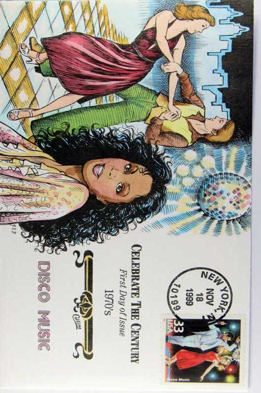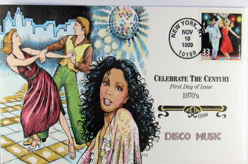Lot #1602. View Larger | Rotate Hand-Painted First Day Cover by Collins, Celebrate the Century, “Disco Music”, 1999 VF
