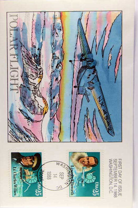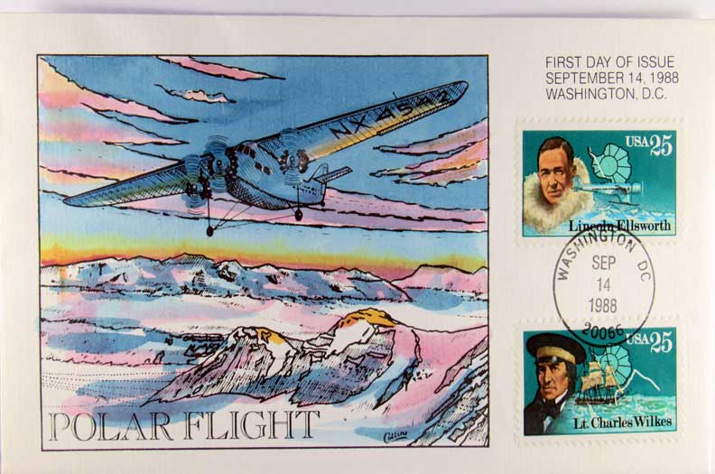 Lot #1580. View Larger | Rotate Hand-Painted First Day Cover by Collins, Polar Exploration, “Polar Flight”, 1988 VF