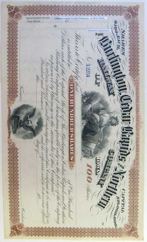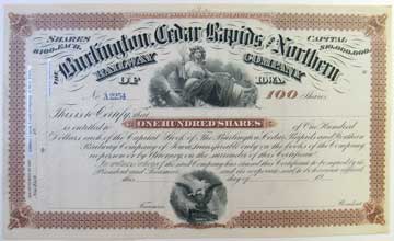 Lot #1428. View Larger | Rotate Early 1900’s Stock Certificate, The Burlington Cedar Rapids & Northern Railway Co. of Iowa VF