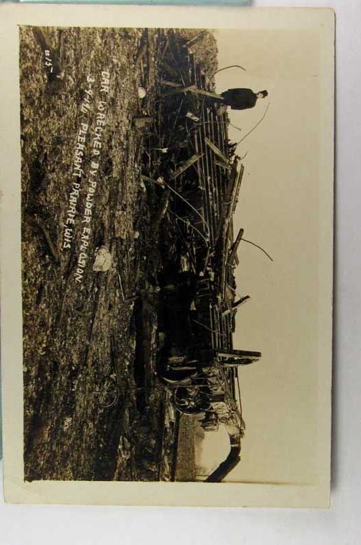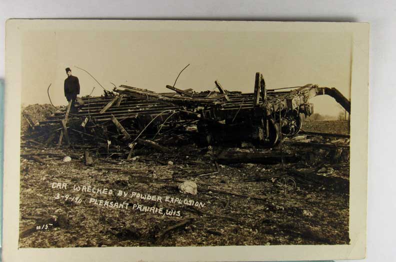 Lot #1426. View Larger | Rotate Train Wreck, Real Photo w/ AZO P.C. back, “Car Wrecked by Powder Explosion, Pleasant Prairie, Wisconsin, 1911” m cor crs F-VF