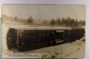 Lot #1475. View Larger | Rotate Train Wreck, “Boston & Maine R.R. Wreck”, East Jaffrey, New Hampshire, Dated 1911, Real Photo, Used 1911 m cor wear Near VF