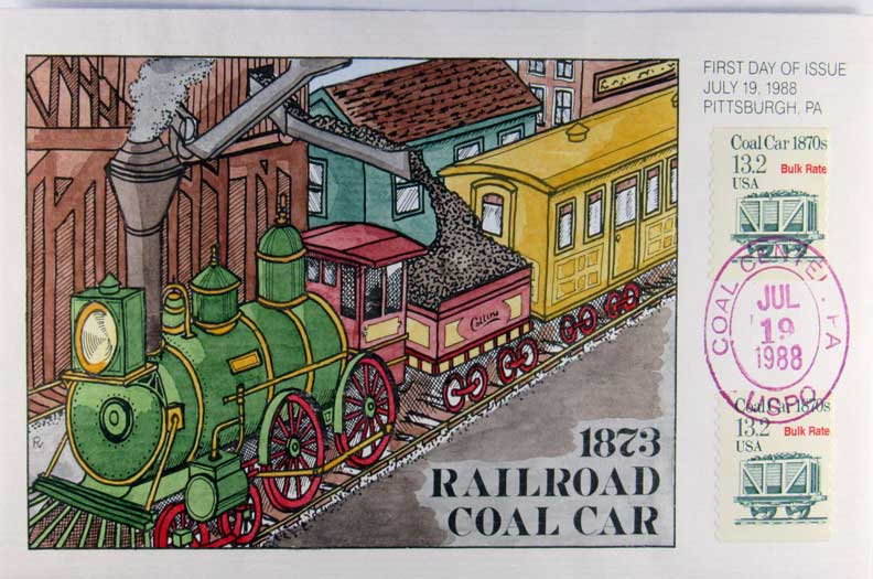 Lot #1452. View Larger | Rotate Hand-Painted First Day Cover by Collins, “1873 Railroad Coal Car”, 1988 VF