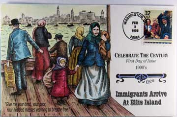 Lot #1545. View Larger | Rotate New York, Hand-Painted First Day Cover by Collins, “Immigrants Arrive at Ellis Island”, 1998 VF