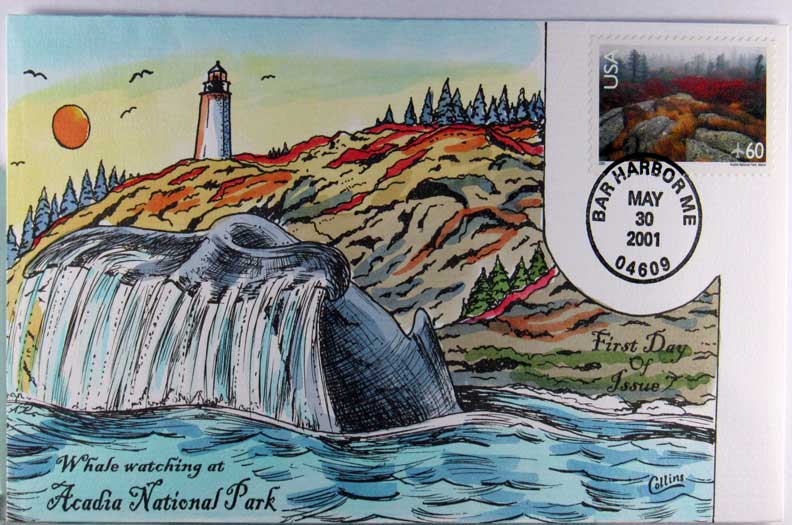 Lot #1537. View Larger | Rotate Maine, Hand-Painted First Day Cover by Collins, “Acadia National Park”, 2001 VF
