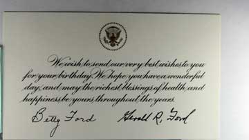 Lot #1056. View Larger | Rotate 1974 Autographs of Gerald & Betty Ford on Birthday Greeting Card w/ Whitehouse Cover w/ Back flts VF Card