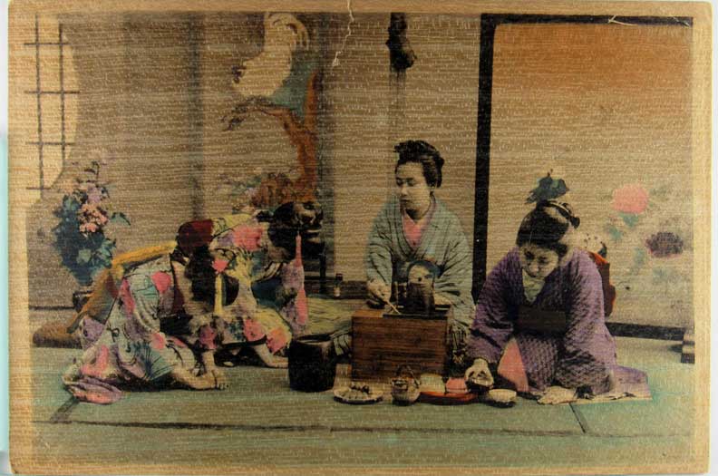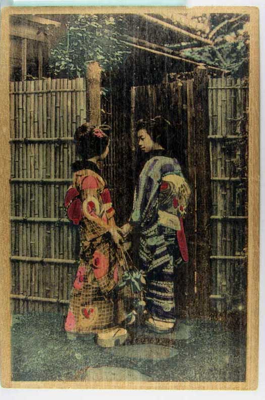 Lot #1565. View Larger | Rotate Japanese Geishas, Novelty Wood-Like Postcard DB edge tear F-VF