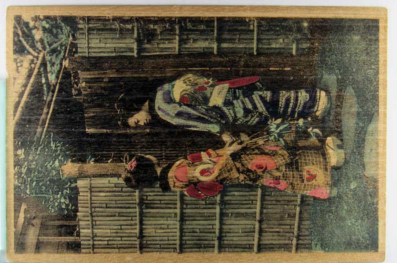 Lot #1563. View Larger | Rotate Japanese Geishas, Novelty Wood-Like Postcard DB m edge nick Near VF
