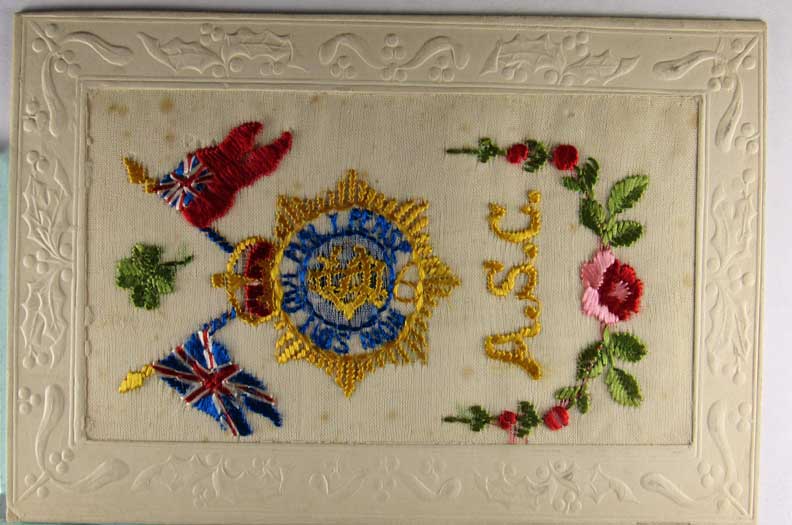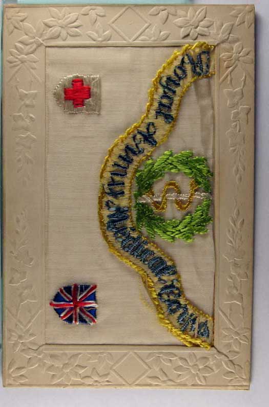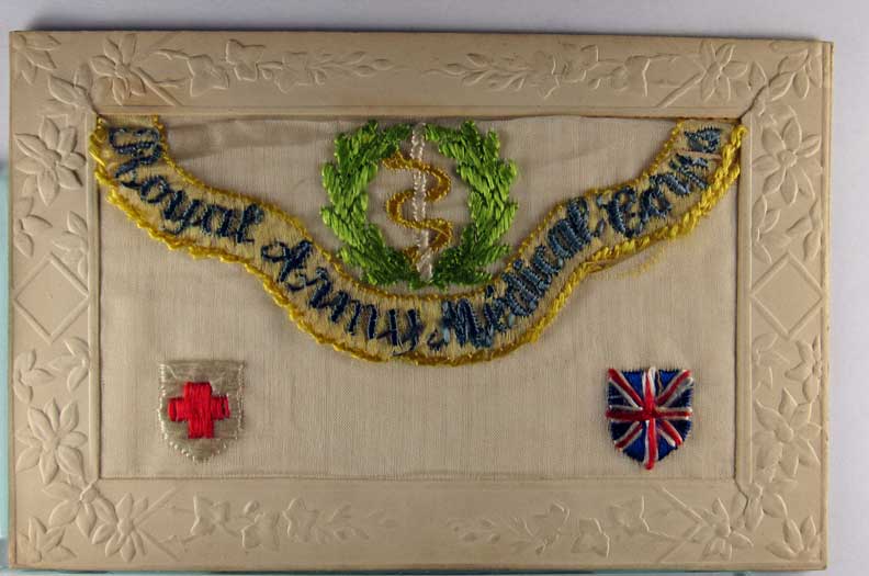 Lot #1117. View Larger | Rotate W.W. I, French Pub., Novelty Embroidered Silk, “Royal Army Medical Corps” DB VF