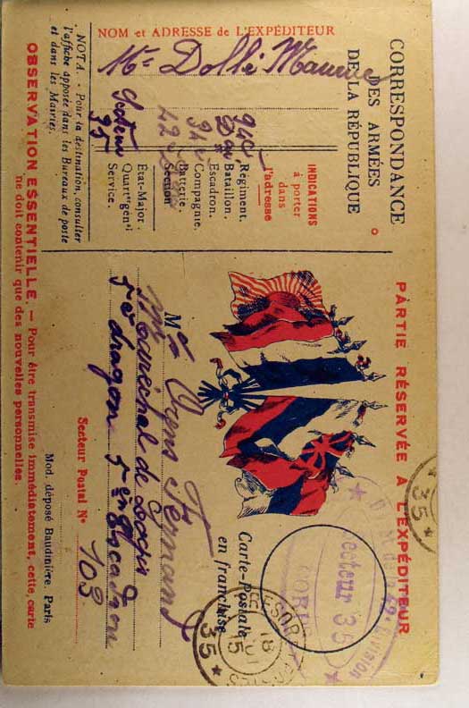 Lot #1116. View Larger | Rotate W.W. I French Soldier’s Use Postcard w/ Color Flags, used 1915 w/ Military Cancel F-VF