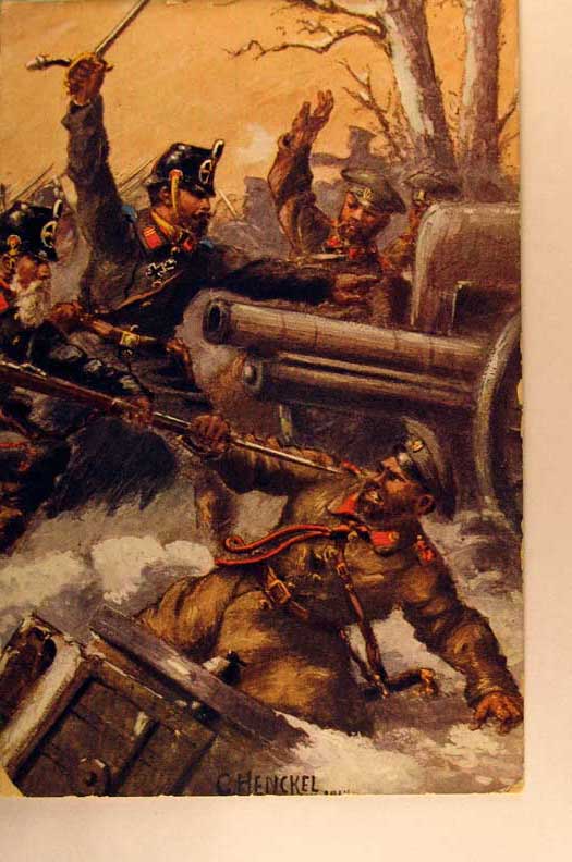 Lot #1145. View Larger | Rotate W.W. I German pub., Art. Sig. Henckel, Attacking Russian Troops, Great Card used 1915 w/ Feldpost and Purple Marking m cor wear F-VF