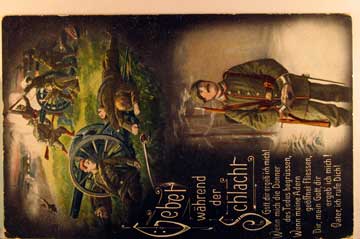 Lot #1158. View Larger | Rotate (4) Four Card ser., W.W. I German pub., “Gebet wahrend der Schlacht”, color, some used 1915 w/ Feldpost m cor wear F
